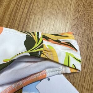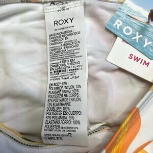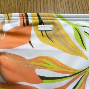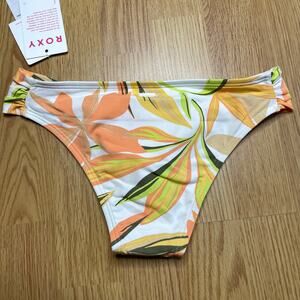 New with tags printed beach classic bikini bottom from Roxy, size XS. Moderate coverage with fathering details on the sides. White background with warm orange and coral tropical print.