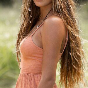 Roxy 90s Beach Hangs Dress Toasted Nut. Vintage tiered smocked mini dress. Color is called Toasted Nut, great vintage condition