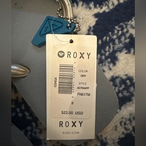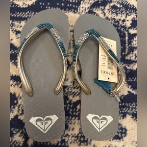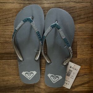 Stylish Roxy flip flops in gray with teal accents. Perfect for casual wear.