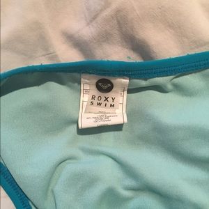 Teal blue, Roxy, bikini bottoms with rouched back and light blue sides. ***There is slight pilling on the back of the bottoms due to use***