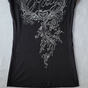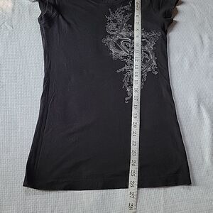 Gray/silver designs on front and back. Cap sleeves. Skinny fit.