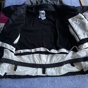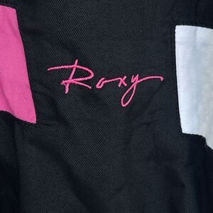 Stylish Roxy jacket with bold color blocks. Features black, pink, and white design. Perfect for casual wear.