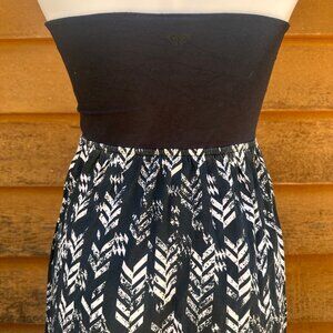 This Roxy maxi dress offers a strapless design with a fitted black bodice and a flowy patterned skirt. Suitable for warm weather and casual outings.