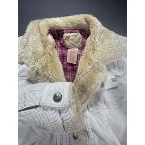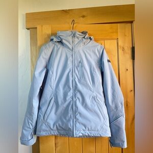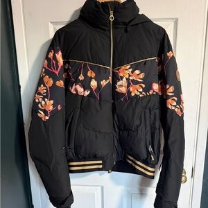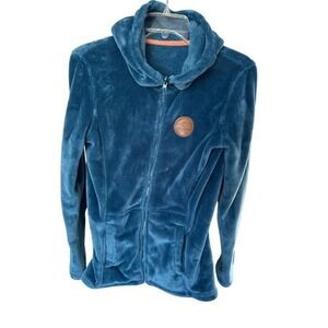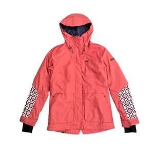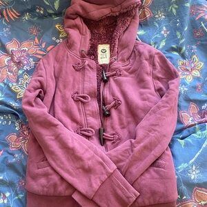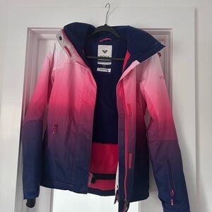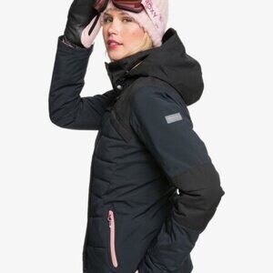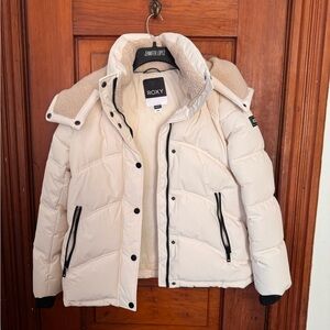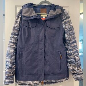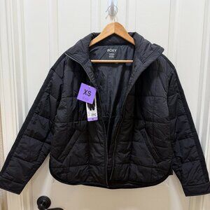 Stylish jacket with Roxy black script on a white background. Features a cozy hood. Worn once. Great condition. Very warm & cozy. Sold as is.