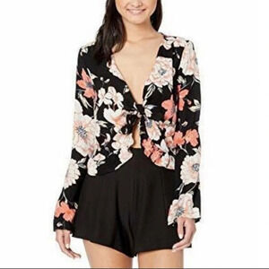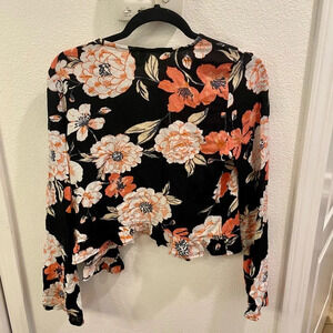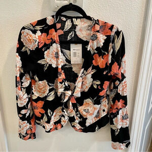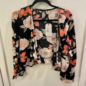 Roxy Blue Day Baby Floral Top Front Tie Cropped Long Sleeve Ruffle Size Small. Black with white and orange/pink flowers. Exposed front. Ruffles along hem. Armpit to armpit about = 18”. Length = 18-19” depending on how you tie it. New with tag. No damage or flaws.