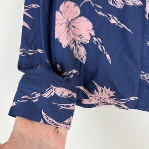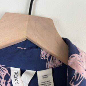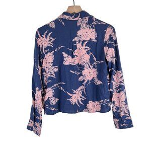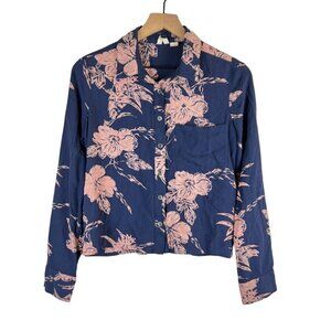 Roxy Blue Floral Mood Indigo Vertigo Cropped Button Down Shirt. Long sleeve. Collared. Blue pink floral printed. Lightweight. Beach, summer, vacation. 100% viscose. Size XS. Armpit to armpit: 18". Armpit to end of sleeve: 17". Length: 19.5". (115)