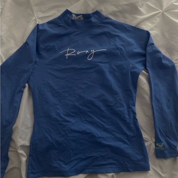 Chic Roxy rash guard in royal blue. Features long sleeves and signature logo. Perfect for summer and the beach!