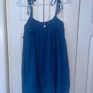 Chic blue sleeveless dress with ruffle details. Perfect for summer outings with shells on the strings. Worn only one time for a few hours.