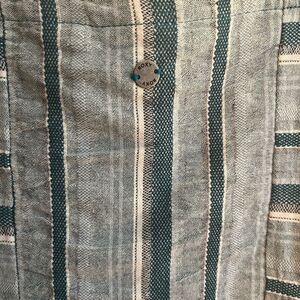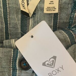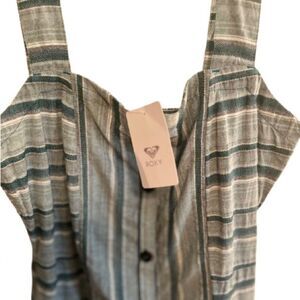Stylish Roxy dress with blue and gray stripes. Button-down front. Sleeveless design.