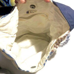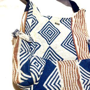 Roxy Boho Shoulder Bag Geometric Woven Hobo Tote Blue Tan Slouchy Canvas-AC133