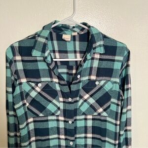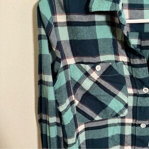 Great condition, minor wear. Roxy. button down flannel shirt. Plaid. Mint green, darker green and white. Chest pockets. Round high low hem. Size XS. missing material tag. Pit to pit laying flat 18” shoulder to hem 24” sleeve (shoulder to hem) 27”. All measurements are approximate and taken lying flat. Smoke free home. No trades, offers welcome.