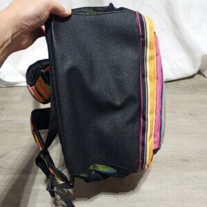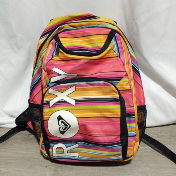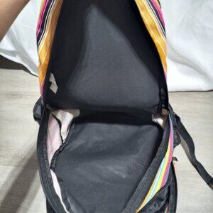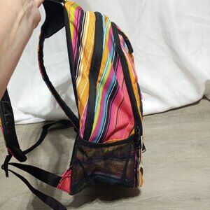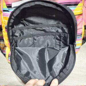 sunglasses pocket, 2 side water bottle pockets, 2 big compartments, 1 smaller pocket