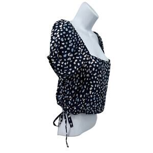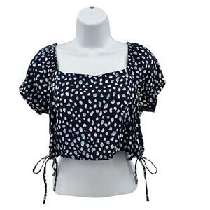 Roxy Dear Amor Crop Top Sz L Blue Dotted Side Cinch Drawstring Short Puff Sleeve