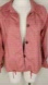Salmon pink colored lightweight jacket features spread collar, button front closure with drawstring at hem, long sleeves with dual button adjustable sleeve straps and raglan sleeves. Cotton/Lyocell fabric blend makes this jacket soft and easy to wear. Also has storm shield fabric layer on back, large scoop pockets, lots of topstitching. Leather and metal logo patch on front left. Two spare buttons are still attached on the interior (one large and one small button).