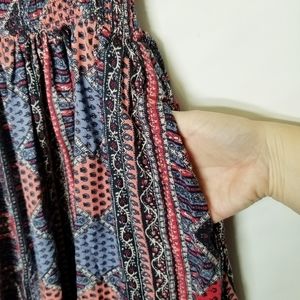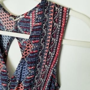Roxy Dress V-neck Pink Purple Blue Patchwork Print Design Smocked cut out back S