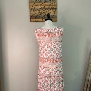 This Roxy piece is a beautiful Lightweight printed viscose crinkle fabric Coral, with Hints of Turquoise, and a White background. This dress also has a V-neckline, full coconut button front opening, yoke panel on waist with gathers for a loose comfortable fit.