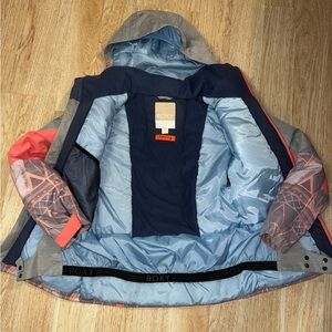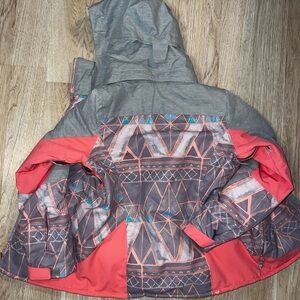 Stylish Roxy jacket with a geometric pattern. Features shades of gray, coral, and blue.