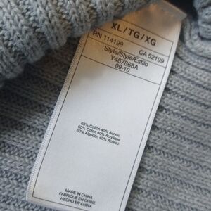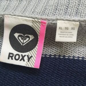 Good used condition, with no stains or tears. A cropped gray and blue stripe cardigan, with a one button closure. Has a shawl collar, circle front hem, and 3/4 wide kimono sleeves. Has the logo on the back.