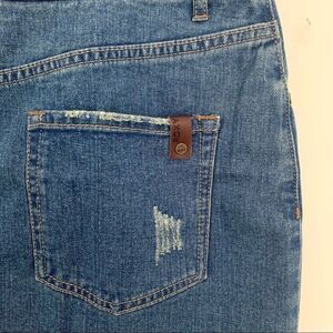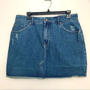 Roxy denim mini skirt with pockets and distressed hem.
