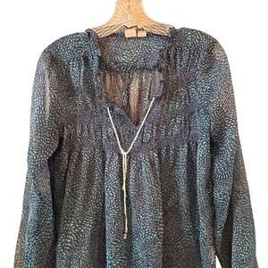 Keywords: Roxy, blouse, tunic, medium, blue, floral, sheer, V-neck, long sleeve, smocked, tie detail, casual, spring, women's clothing.