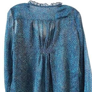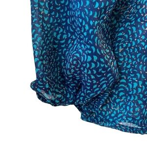 This Roxy blouse is a women's medium tunic in a regular fit. It features a blue floral pattern on sheer fabric, with a V-neckline and long sleeves. The blouse includes smocked detailing and a tie detail, making it suitable for casual spring occasions. It is made from sheer material and requires hand washing. The blouse is pre-owned but in excellent condition.