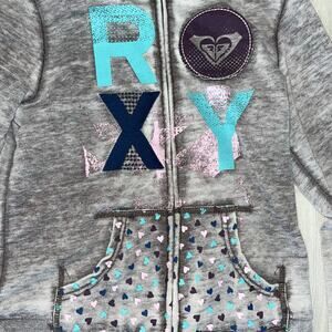 Roxy juniors size XXS front zip distressed logo hoodie jacket. Pit to pit 16" and shoulder to bottom 22". In excellent condition from a smoke free home.