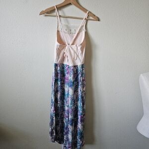Stylish light pink top with floral bottom maxi dress. Features delicate spaghetti straps.