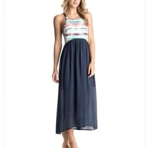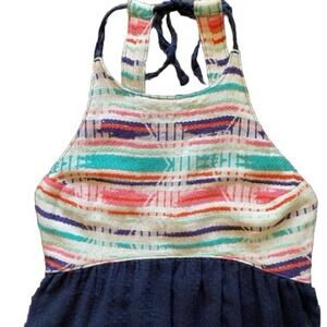 Stylish maxi dress with multicolor striped top. Flowy navy skirt. Halter neck design.