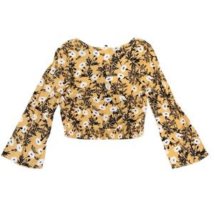 Pre owned.Small.This Roxy blouse showcases a vibrant yellow and cream palette with elegant bell sleeves and a stylish wrap design. Crafted for comfort and style, it offers a flowy silhouette perfect for any occasion. The lightweight fabric ensures a breezy feel, making it a versatile addition to your wardrobe.