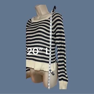 Classic striped sweater with navy and ivory alternating colors trimmed with ivory cream cuffs waist and rounded collar. Measures 16” P2P and is preowned but great condition, no snags. Care label cut but feels like washable acrylic or cotton or a blend.