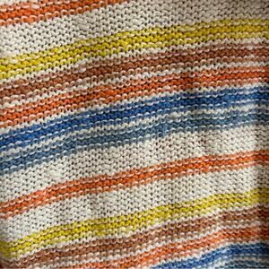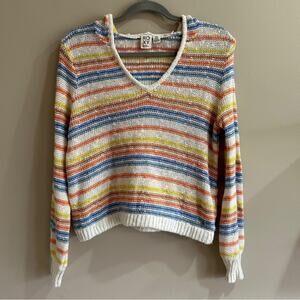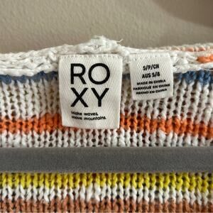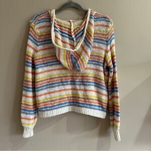Roxy nomadic squad white colorful striped loose knit v neck hooded sweater. The material is 100% cotton. The shirt is in great condition and a size small.