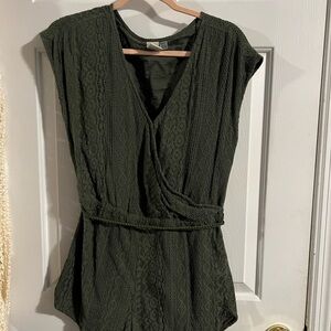 Stylish lace romper. V-neck design. Short sleeves. Belted waist. Perfect for casual outings.