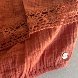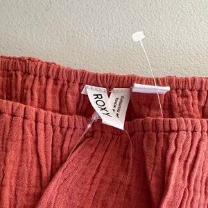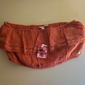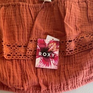 Stylish Roxy top in vibrant orange. Features lace detailing. Perfect for casual wear.
