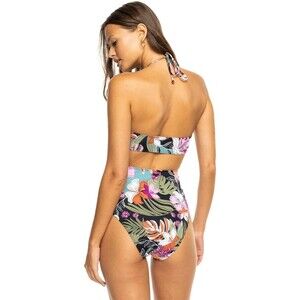 Design features: Halter tie neckline with plunge front and ring connector, midriff cutout (monokini style), high-waist bottom, high-leg cut, multicolor tropical floral pattern, Roxy logo tag detail