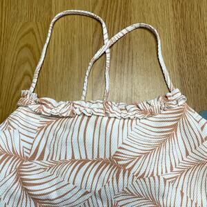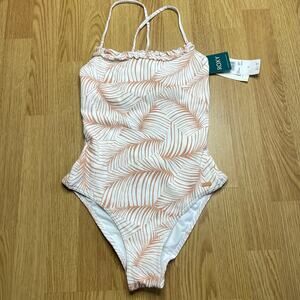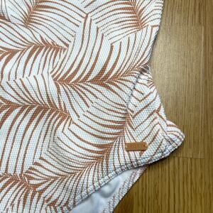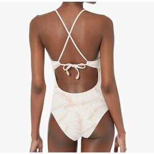 New with tags white and tan Palm Tree Dreams One Piece Swimsuit from Roxy, size S. Recycled stretch-nylon with a piqué texture is both soft and durable. Criss crossed back-tie straps adjust for custom comfort. Thicker lining on bright white background prints helps avoid transparency. Regular support with removable cups best suited to A, B and C cup sizes.