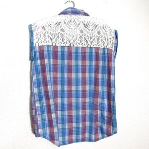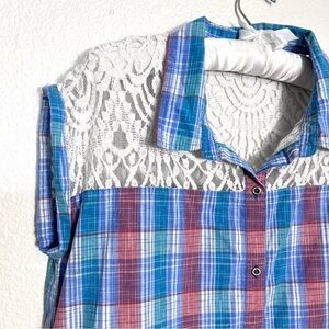 Roxy Plaid Button Down with Sheer Lace Detail Short Sleeves