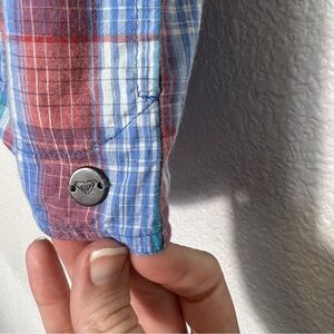 Roxy Plaid Button Down Sheer Lace Short Sleeves Size Medium Boho Western Beachy