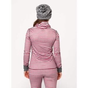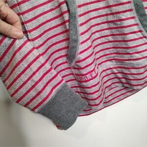 Roxy Plain Jane Slouchy Neck Striped Sweater in Magenta/Gray Size Large. Features a slouchy neckline with black adjustable drawstrings, a large kangaroo pocket, gray/magenta striped pattern throughout, & dark gray accents/trim.