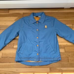 Light blue jacket coat with an orange floral lining. Size small. 100% polyester shell; 100% cotton lining. Made in Hong Kong. Machine washable. Piling noted to the inside liner. I believe it had a drawstring waist but the string is missing. A few small snags to the left arm and a few small stains as pictured in close ups. Two front pockets and a single back pocket with a snap. Front snap closure.