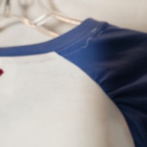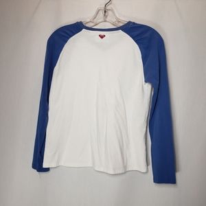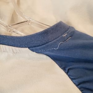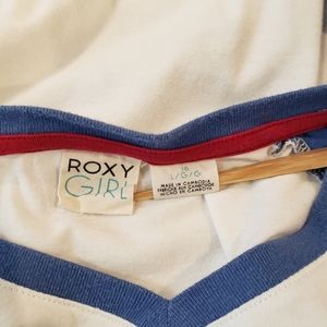 Roxy tee with blue raglan sleeve tee with screened sunset and palm tree design. Gently worn and in good condition. Slightly loose threads near back of the neckline. Size L