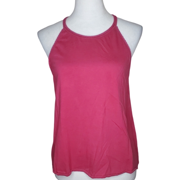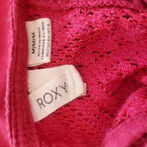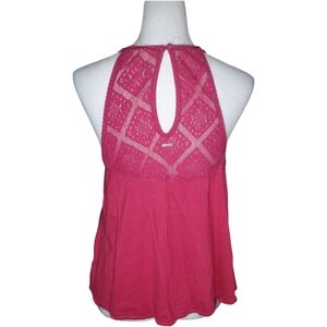 Roxy Raspberry Crochet Keyhole Halter Top. Rouleau Button Loop Close In Back.
