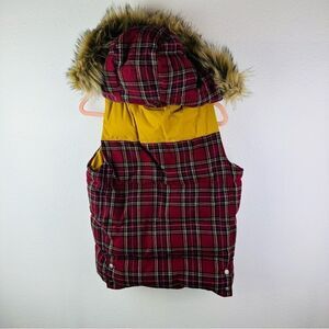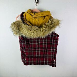 Roxy Red Plaid Down Wool Blend Faux Fur Trim Hooded Puffer Vest Size M
