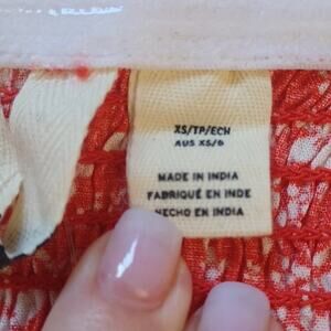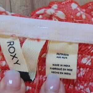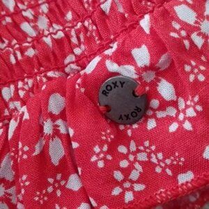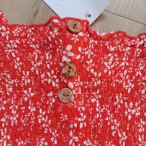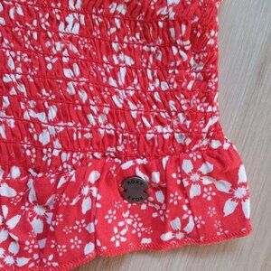 Roxy 90s Secret Sister crop top in red with white floral pattern. Smocked bodice. Adjustable straps. Ruffled detail. Silicone rubber gripper. New with tags. One owner. Made in India.
