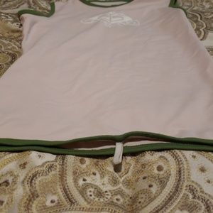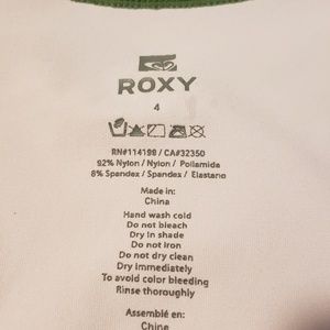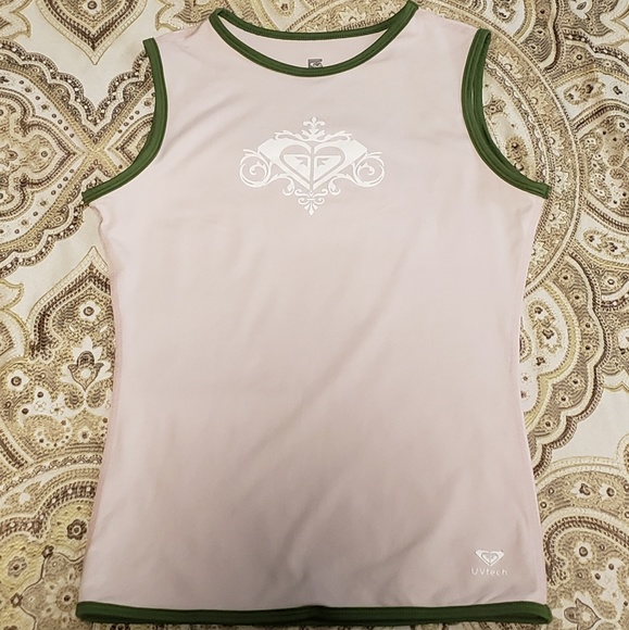 Roxy Pink short sleeve rash guard with green piping. Slight peeling on "UV Tech" logo, and small stain on back of neck area. Shirt features an elastic near front bottom for clipping to pants. Great for surfing, body, boogie, or wake boarding. Or any water activities. Fits true to size for a rash guard, (rash guards fit skin tight)