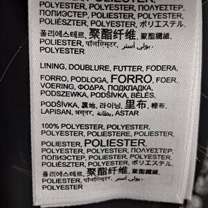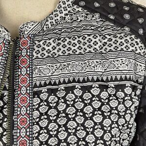 Full zip front jacket is quilted all over. Black and white mixed patterns with an accent trim down the front on either side of the zipper. Elastic at the cuffs. Ribbing at the bottom hem. Lined.