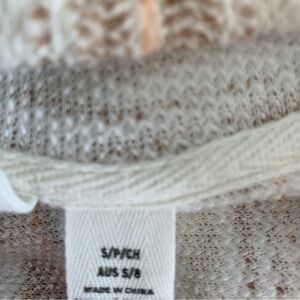 This is a beach ready lightweight Roxy striped cropped poncho sweater. It features a soft beige/cream stripe pattern, relaxed drape, V-neckline, and a hood with drawstrings. It’s perfect for layering after the beach, summer evenings, or casual comfy outfits. It’s in great pre owned condition no stains or flaws.