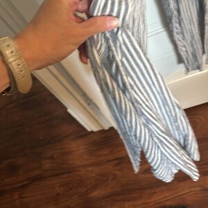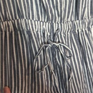 Stylish striped jumpsuit with adjustable straps. Features a drawstring waist for a perfect fit.