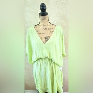 A drawstring cinches the waist of this billowy cover-up dress cut to a mini length with a deeply dipped V-necklines.