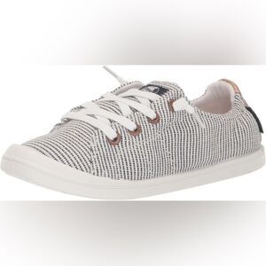 Roxy Bayshore blue and white striped low top nautical sneakers with rose gold metallic accents. Comfortable and trendy design. There are some discolorations, which are shown in photos, but these are in overall great condition. The size is a little off. It says 7.5, but it fits like a 6. I have included a measurement of the sneaker to help with sizing! Great for everyday wear, especially in the Summer.
