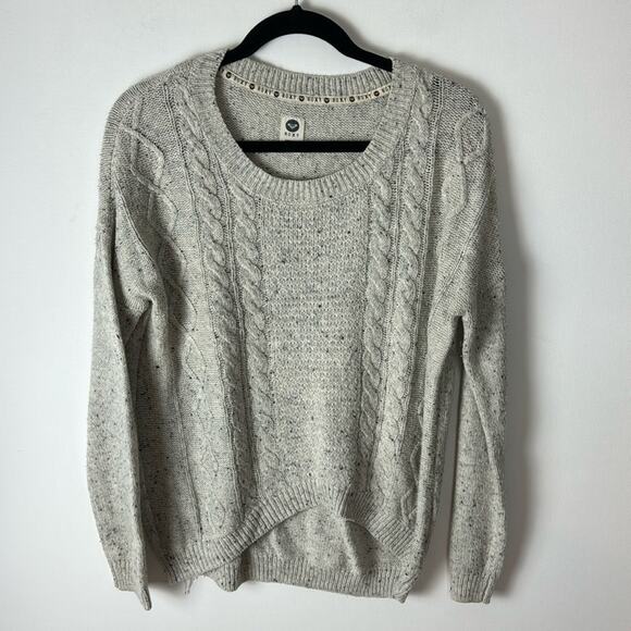 Gently Used Roxy Cable Knit Sweater. This is a women's medium. Off white / light tan color throughout. Ligthweight. Roxy metal tag on the waist. 99% cotton, 1% wool.